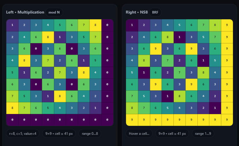 The multiplication table includes zeros (since multiples of 9 vanish mod 9). In contrast, NS8 remaps every value into the range 1..N, so there are no gaps.Row Behavior
